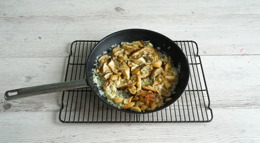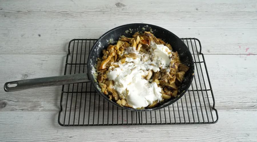 Для начинки грибы тщательно моют, нарезают тонкими ломтиками и обжаривают с мелко нарезанным луком до золотистой корочки. Чтобы грибы были особенно ароматными, их можно предварительно отварить в слегка подсоленной воде около 10 минут, а затем обсушить перед обжариванием. Это помогает убрать лишнюю влагу и усилить грибной вкус. После того, как грибы и лук подрумянились, к ним добавляют сметану и немного грибного отвара, чтобы создать густую, кремообразную массу. Тушат начинку несколько минут до загустения. В конце добавляют соль и перец по вкусу.