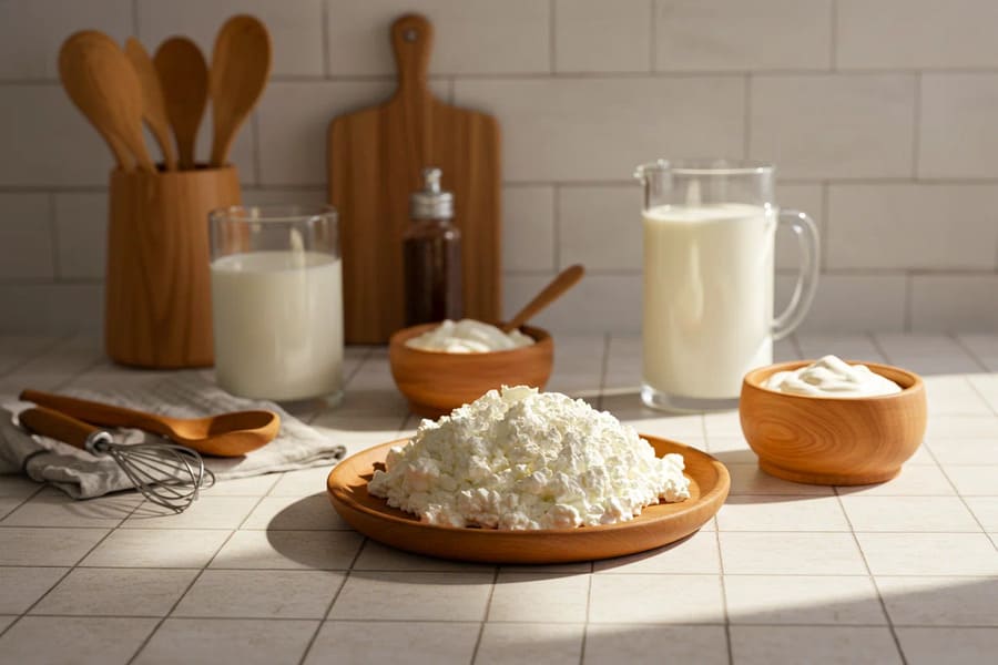 Настоящий творог рождается в процессе естественного сквашивания молока. Когда молочнокислые бактерии начинают перерабатывать лактозу, молочный белок — казеин — сворачивается, образуя плотные хлопья. Именно они и становятся базой для будущего творога. Затем смесь аккуратно прогревается, чтобы укрепить структуру творожных хлопьев, после чего отделяется сыворотка. Этот процесс кажется простым, но в нём есть множество нюансов: важна температура молока, свежесть закваски, скорость нагрева. Малейшее отклонение — и текстура меняется. Правильно приготовленный творог всегда мягкий, равномерно зернистый и слегка кремовый, без кислого запаха и излишней сухости.
